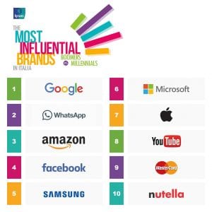 Google, WhatsApp e Amazon sono i marchi più influenti in Italia. Nella classifica The most Influential Brands 2017, risultato di un’indagine Ipsos, l’unico marchio italiano è Nutella, al decimo posto. Nell’era digital, infatti, sono i colossi d’oltreoceano a dominare la Top 10.