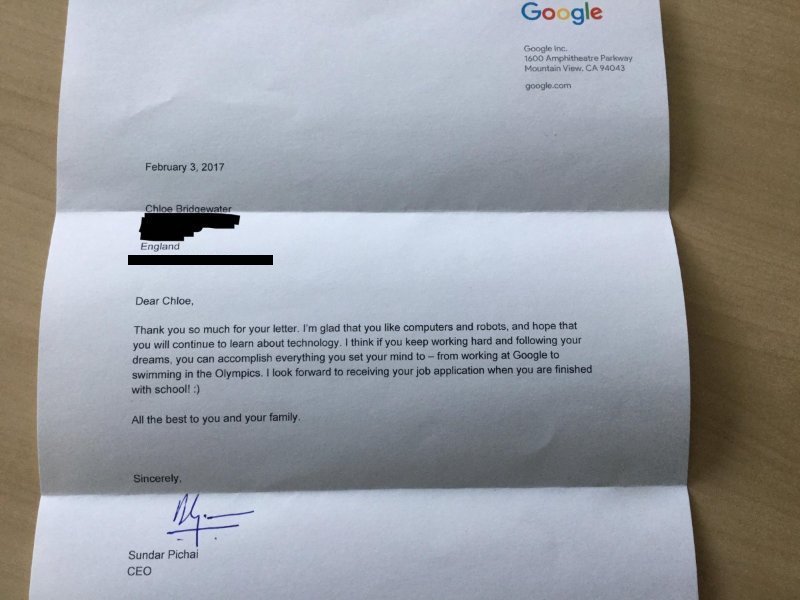 Pichai ha ringraziato Chloe in una lettera scritta su carta intestata: «Sono fiero che ami i computer e i robot e spero che continuerai a imparare cose che riguardano la tecnologia. Credo che, se continuerai a lavorare duro e a seguire i tuoi sogni, potrai raggiungere ogni obiettivo che hai in mente. Lavorare a Google così come nuotare alle Olimpiadi. Aspetto di ricevere la tua candidatura quando avrai finito la scuola».