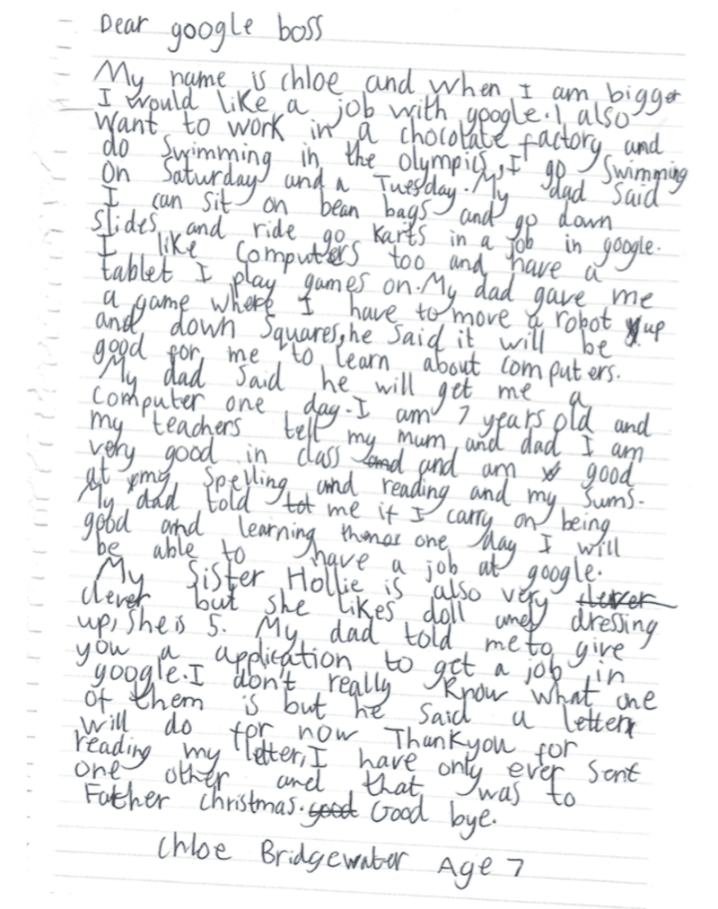 Come scrive subito dopo Chloe, è stato proprio il padre a suggerirle di inviare una “job application” già adesso per ottenere il lavoro. La bambina non sa bene di cosa si tratti, ma ha capito di dover scrivere una lettera, come quella che ha inviato una volta a Babbo Natale.
