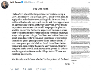 Come Bill Gates e Mark Zuckerberg, anche il fondatore di Amazon Jeff Bezos si dedica ad attività filantropiche. Creerà un fondo di beneficenza, con un investimento iniziale di due miliardi di dollari, con lo scopo di aiutare i senzatetto e offrire un’istruzione adeguata ai bambini indigenti.