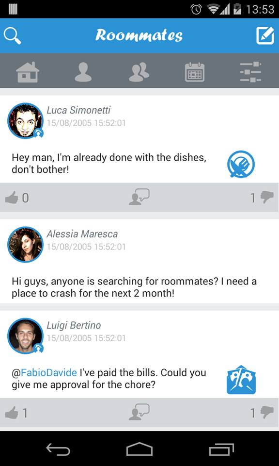 Due ragazzi hanno inventato un’app che risolve il problema alla radice, aiutandoti nella ricerca del coinquilino perfetto. Si chiama Roommates ed è un’idea di Fabio Davide, napoletano, 23 anni, e Luigi Bertino, calabrese, 26 anni, entrambi studenti alla Sapienza di Roma. Collabora allo sviluppo Luca Simonetti, ex dipendente Ericcson: