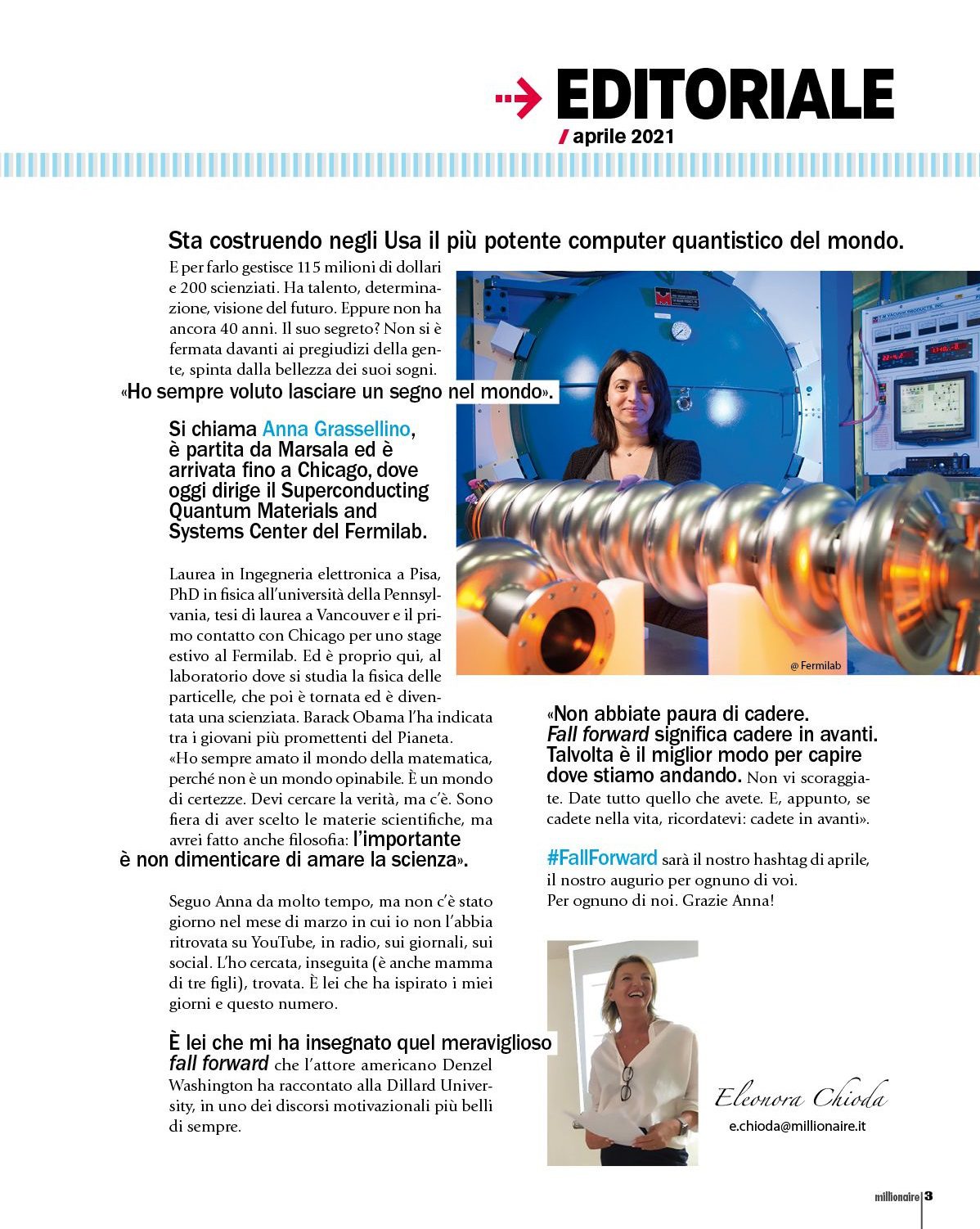 Sta costruendo negli Usa il più potente computer quantistico del mondo. E per farlo gestisce 115 milioni di dollari e 200 scienziati. Ha talento, determinazione, visione del futuro. Eppure non ha ancora 40 anni. Il suo segreto? Non si è fermata davanti ai pregiudizi della gente, spinta dalla bellezza dei suoi sogni. «Ho sempre voluto lasciare un segno nel mondo». Si chiama Anna Grassellino, è partita da Marsala ed è arrivata fino a Chicago, dove oggi dirige il Superconducting Quantum Materials and Systems Center del Fermilab.