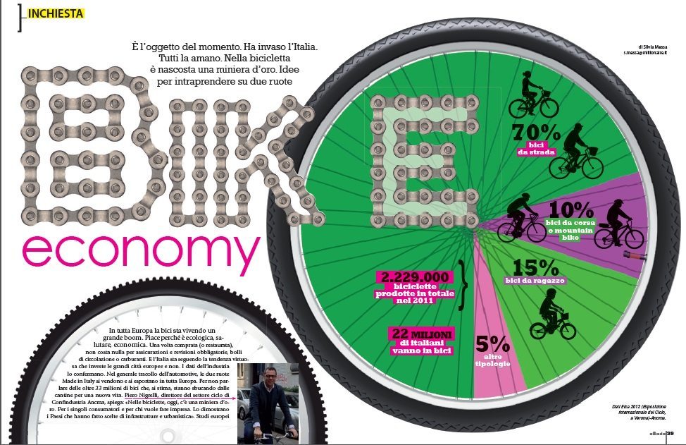La bici fa tendenza: è ecologica, economica e salutare. Nascono occasioni di business, alcune innovative altre più tradizionali, che sfruttano dati che impressionano: 2.229.000 bici prodotte nel 2011 nel nostro Paese, più di 22 milioni di connazionali che le usano: