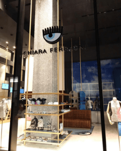 La vetrina è già pronta, con il nome del marchio e un occhio azzurro stilizzato, il logo della sua linea di scarpe, borse e accessori.