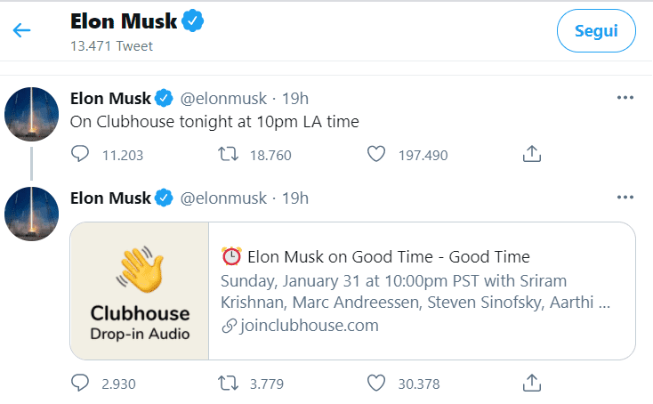 Il risultato? Un vero e proprio boom. A 10 mesi dal lancio, ieri Clubhouse ha avuto anche la consacrazione di Elon Musk. L’imprenditore di Tesla e Space X, con un tweet, ha dato appuntamento ai suoi follower sul social. 5000 persone in una stanza, a parlare per oltre 2 ore di Marte, energia, intelligenza artificiale.
