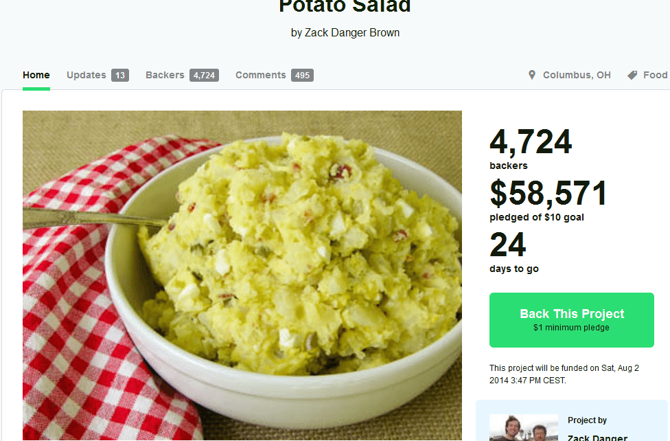 Il 3 luglio Zack, appassionato di insalate di patate, inizia avvia una campagna su Kickstarter, il celebre sito americano di raccolta fondi: «Voglio preparare un’insalata di patate. Non ho ancora deciso come farla. Aiutatemi» scrive per convincere gli utenti a sostenerlo economicamente. In soli pochi giorni supera i 10 dollari che aveva chiesto inizialmente per prepararla: incredibilmente, più di 4mila persone appoggiano la sua causa per una cifra che continua a crescere: mancano 24 giorni alla chiusura delle donazioni.