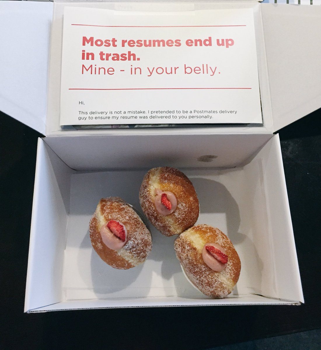 Così il ragazzo ha stampato una maglietta simile a quella che indossano i corrieri. Ha acquistato i donuts in uno dei più rinomati forni della città. E ha inserito in ogni scatola una lettera di presentazione con un link al curriculum.