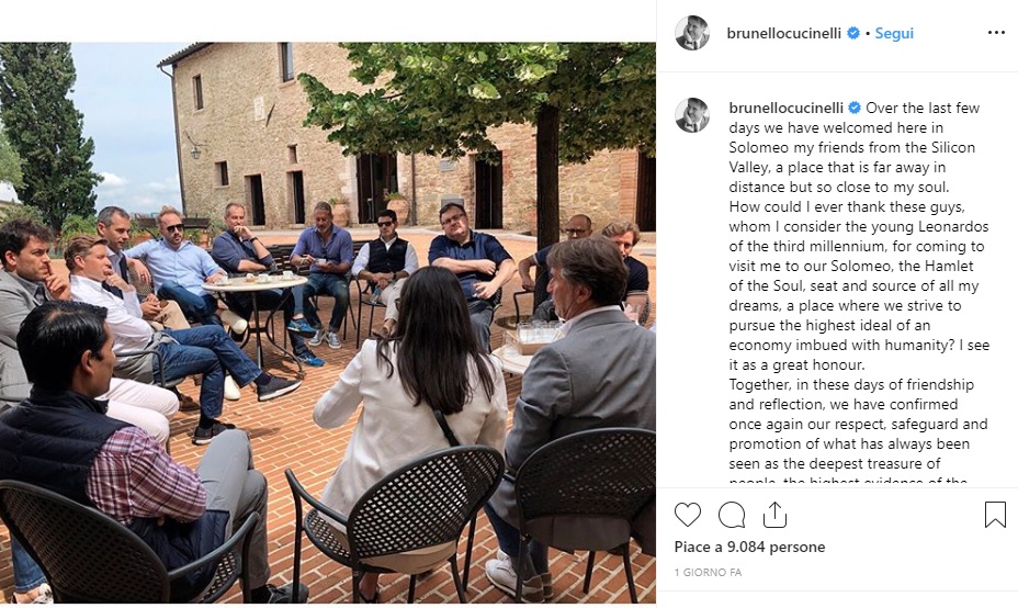L’incontro si è svolto dal 23 al 25 maggio, nel massimo riserbo. Solo ieri è stato reso noto dallo stesso Cucinelli con un post su Instagram. «Nei giorni scorsi abbiamo accolto qui a Solomeo i miei amici della Silicon Valley, un posto lontano eppure molto vicino nell’anima».