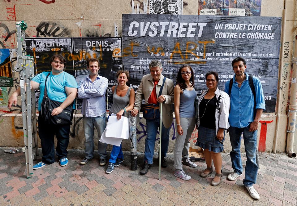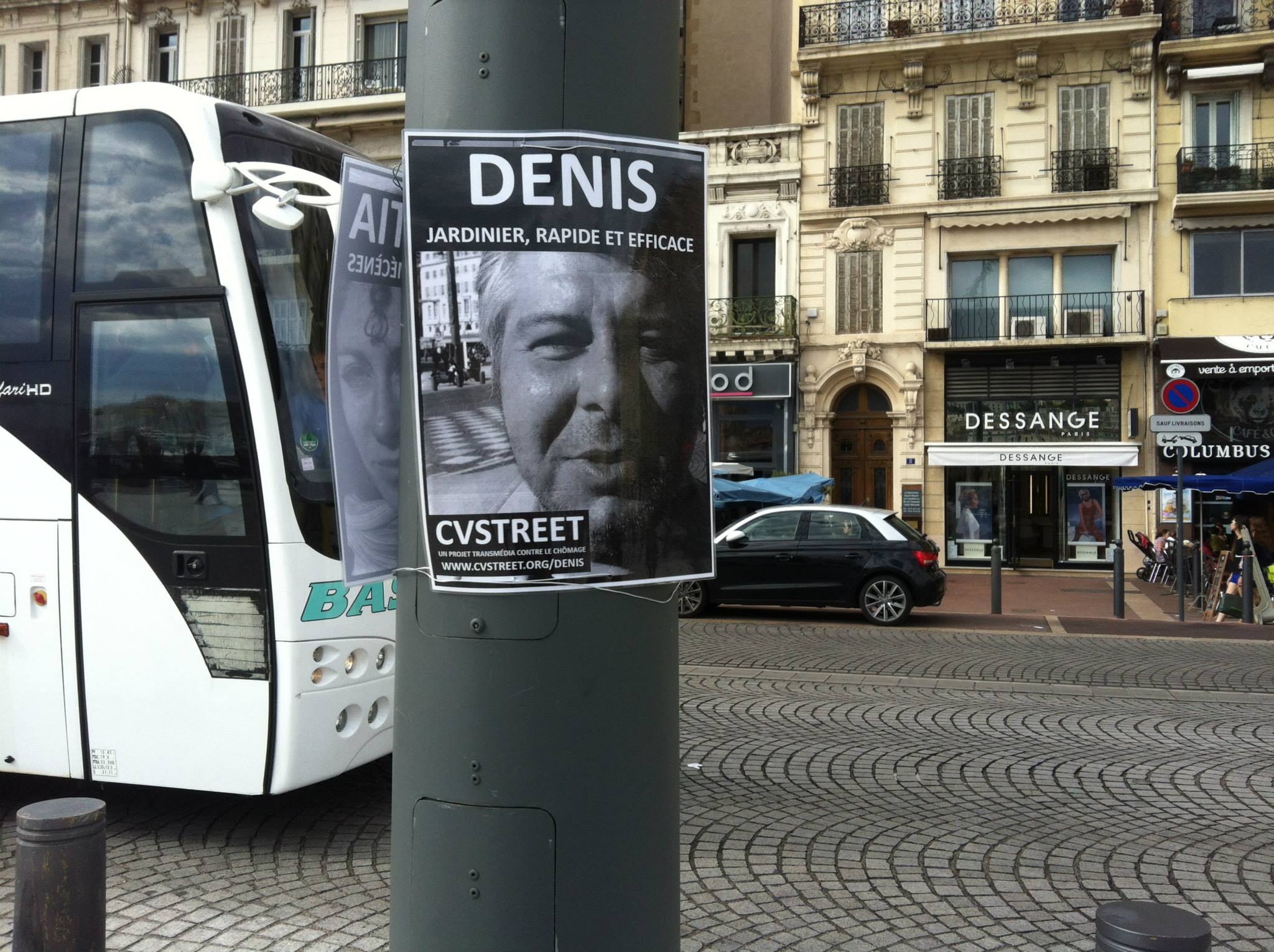 È lui il fondatore di un’associazione, CVStreet che stampa manifesti con nome, volto e specializzazione di persone alla ricerca di un lavoro. Una volta realizzati, gli originali cv vengono incollati alle pareti di edifici nelle vetrine di negozi o alle mura di Marsiglia, la città dove vive Cyril: