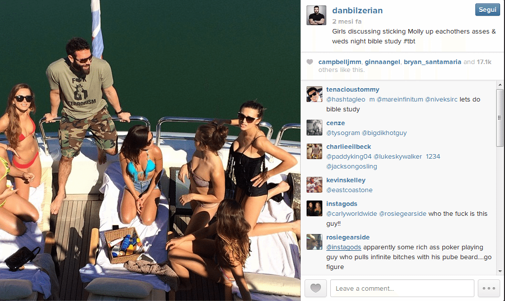 Ma a rafforzare la sua popolarità c’è il suo profilo Instagram che può contare su 1 milione di follower che guardano ogni giorno le sue foto: yatch, soldi, macchine di lusso, armi. Ma soprattutto donne, di cui ama circondarsi, che lui tratta alla stregua di oggetti da collezione: