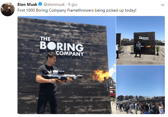 Tra le varie iniziative del visionario imprenditore, ci sono anche gli strani gadget che Boring Company vende online. I primi 1000 lanciafiamme, venduti a 500 dollari l’uno, sono stati appena consegnati, come ha annunciato Musk in un tweet. Il prossimo passo? Dei “Lego” a grandezza naturale.
