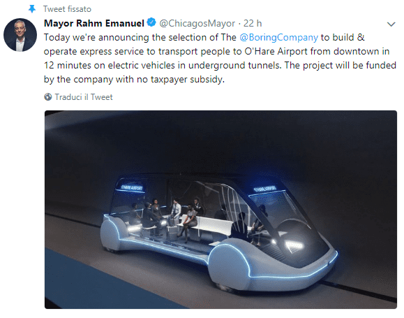 The Boring Company si farà carico di ogni fase e costo dell’operazione. Come si legge nell’annuncio di ieri, dovrà “progettare costruire, finanziare, gestire e mantenere il servizio O’Hare Express”. Musk garantisce anche che ogni spostamento costerà meno della metà di una corsa in taxi per lo stesso tragitto.