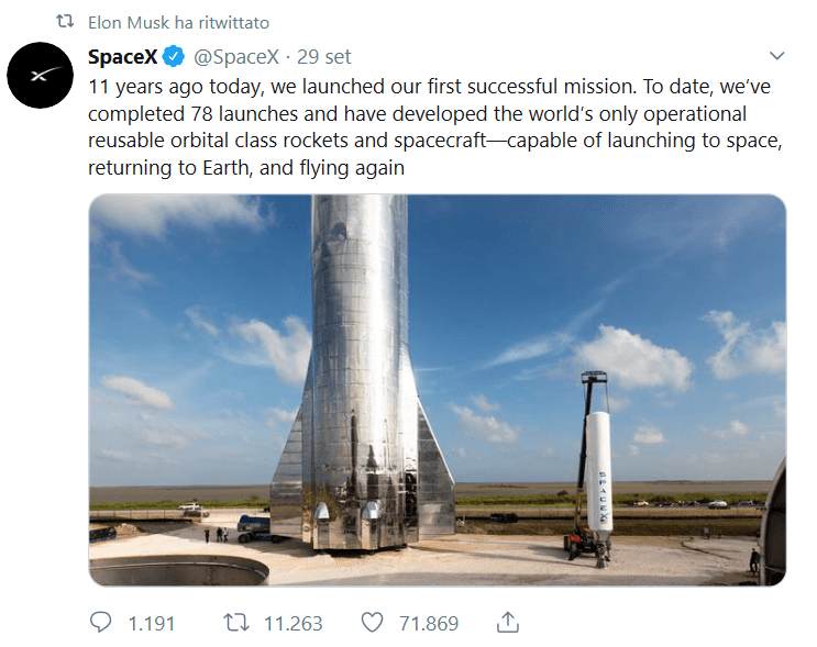 «11 anni fa, oggi, abbiamo lanciato la nostra prima missione di successo. Finora, abbiamo completato 78 lanci e abbiamo sviluppato gli unici razzi e veicoli spaziali riutilizzabili attualmente operativi al mondo. Sono in grado di andare nello spazio, tornare sulla Terra e volare di nuovo». Con un tweet, in perfetto stile Elon Musk, Space X festeggia l’anniversario del primo lancio in orbita e presenta Starship. La navicella è progettata per portare l’uomo sulla Luna e su Marte. Musk aveva pubblicato la prima foto del prototipo lo scorso gennaio. Sabato a Boca Chica, in Texas, c’è stata la presentazione ufficiale.