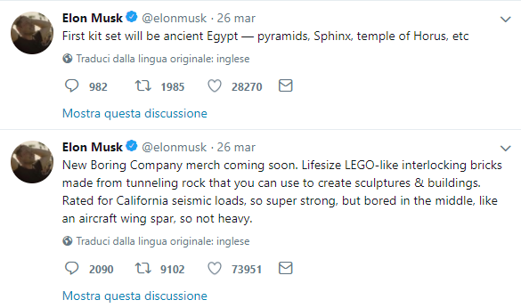 Saranno realizzati con il materiale roccioso ricavato dagli scavi per i tunnel. Mattoni antisismici, robusti ma al tempo stesso leggeri, perché vuoti al loro interno, proprio «come i Lego», assicura Musk, che in un secondo cinguettio su Twitter aggiunge: «Il primo kit sarà l’antico Egitto: Piramidi, Sfinge, Tempio di Horus ecc.»