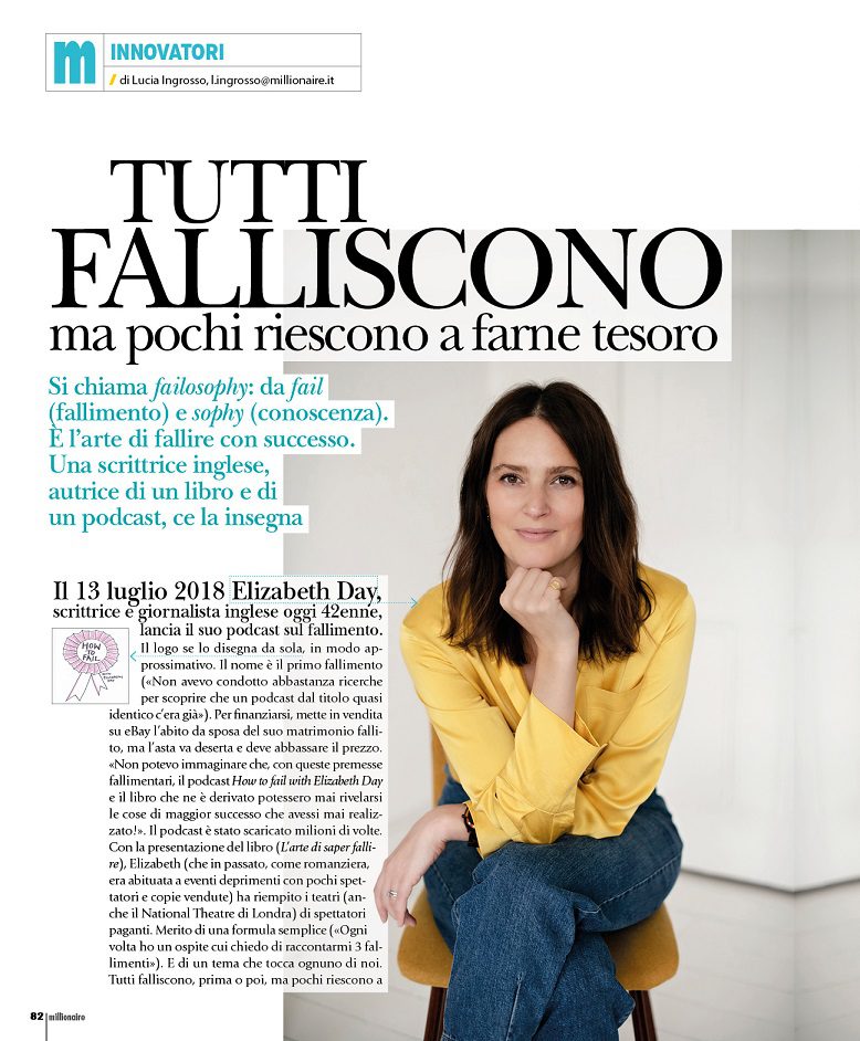 Il 13 luglio 2018 Elizabeth Day, scrittrice e giornalista inglese oggi 42enne, lancia il suo podcast sul fallimento. Il logo se lo disegna da sola, in modo approssimativo. Il nome è il primo fallimento («Non avevo condotto abbastanza ricerche per scoprire che un podcast dal titolo quasi identico c’era già»). Per finanziarsi, mette in vendita su eBay l’abito da sposa del suo matrimonio fallito, ma l’asta va deserta e deve abbassare il prezzo. «Non potevo immaginare che, con queste premesse fallimentari, il podcast How to fail with Elizabeth Day e il libro che ne è derivato potessero mai rivelarsi le cose di maggior successo che avessi mai realizzato!».