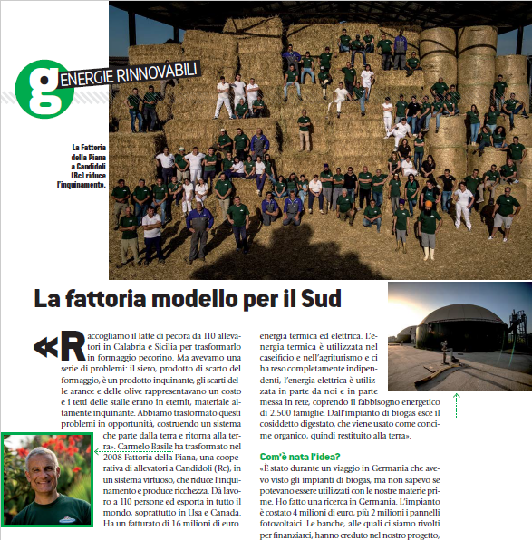 «Raccogliamo il latte di pecora da 110 allevatori in Calabria e Sicilia per trasformarlo in formaggio pecorino. Ma avevamo una serie di problemi: il siero, prodotto di scarto del formaggio, è un prodotto inquinante, gli scarti delle arance e delle olive rappresentavano un costo e i tetti delle stalle erano in eternit, materiale altamente inquinante. Abbiamo trasformato questi problemi in opportunità, costruendo un sistema che parte dalla terra e ritorna alla terra». Carmelo Basile ha trasformato nel 2008 Fattoria della Piana, una cooperativa di allevatori a Candidoni (Rc), in un sistema virtuoso, che riduce l’inquinamento e produce ricchezza. Dà lavoro a 110 persone ed esporta in tutto il mondo, soprattutto in Usa e Canada. Ha un fatturato di 16 milioni di euro.