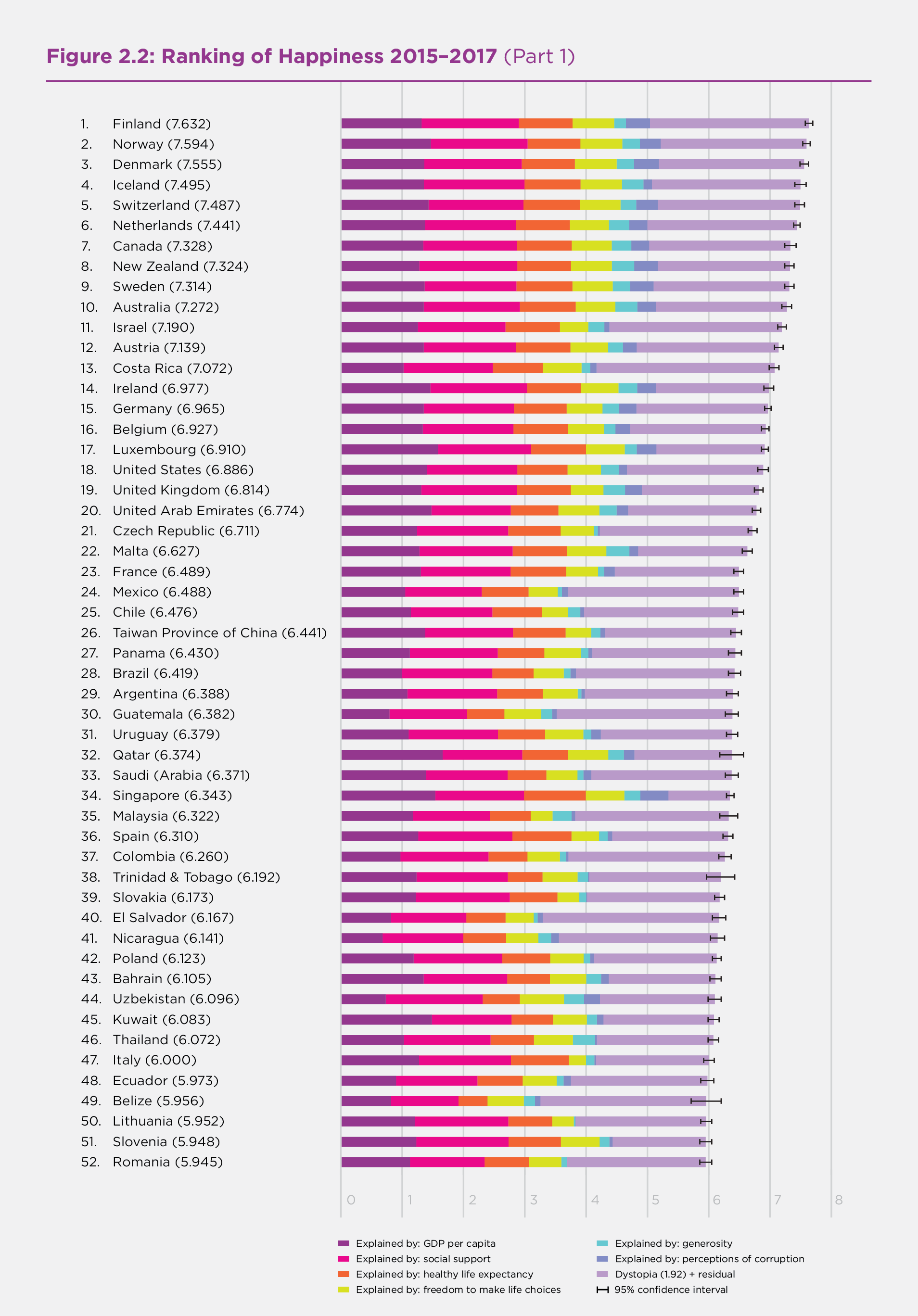 Reddito pro capite, sostegno sociale, aspettativa di vita in buona salute, libertà, generosità e assenza di corruzione sono le principali variabili utilizzate per l’analisi. In base ai sondaggi raccolti tra il 2015 e il 2017, dopo i finlandesi, i più felici al mondo sono gli abitanti di Norvegia, Danimarca, Islanda, Svizzera, Olanda, Canada, Nuova Zelanda, Svezia e Australia. Il Nord Europa è l’area più felice del Pianeta. Benché più ricchi Gli Stati Uniti sono 18esimi, penalizzati da obesità e depressione. Hanno perso quattro posizioni rispetto allo scorso anno. In fondo alla classifica si trova il Burundi.