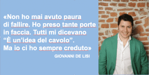 Giovanni De Lisi avrebbe dovuto fare l’avvocato. A 19 anni si era iscritto a Giurisprudenza, ma il suo sogno era diventare imprenditore. «Quando ho detto a mio padre (un costruttore ferroviario) che volevo lavorare per lui, mi ha mandato in cantiere. Vai e inizia dal basso, a 1000 km da casa» ha raccontato Giovanni a Millionaire. Giovanni si trasferisce a Busto Arsizio e inizia ad appassionarsi. Studia. Fino ad aver l’idea della traversa ecosostenibile, che produce energia pulita al passaggio dei treni. Entra in PoliHub. Raccoglie più di 3 milioni di euro a fondo perduto, investe in ricerca e sviluppo e brevetta la traversa in 79 Paesi. Ma c’è di più. Assume 14 ingegneri a tempo indeterminato. «Recentemente ho letto la lettera di un avvocato che dopo 30 anni di carriera scriveva alla Cassa Forense dicendo: ho lavorato 30 anni e non ho in mano nulla. A 19 anni ho capito che dovevo guardare oltre…».