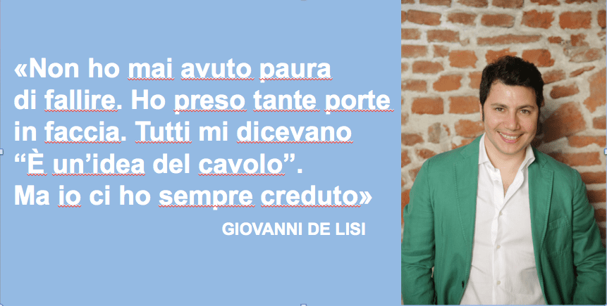 Giovanni De Lisi avrebbe dovuto fare l’avvocato. A 19 anni si era iscritto a Giurisprudenza, ma il suo sogno era diventare imprenditore. «Quando ho detto a mio padre (un costruttore ferroviario) che volevo lavorare per lui, mi ha mandato in cantiere. Vai e inizia dal basso, a 1000 km da casa» ha raccontato Giovanni a Millionaire. Giovanni si trasferisce a Busto Arsizio e inizia ad appassionarsi. Studia. Fino ad aver l’idea della traversa ecosostenibile, che produce energia pulita al passaggio dei treni. Entra in PoliHub. Raccoglie più di 3 milioni di euro a fondo perduto, investe in ricerca e sviluppo e brevetta la traversa in 79 Paesi. Ma c’è di più. Assume 14 ingegneri a tempo indeterminato. «Recentemente ho letto la lettera di un avvocato che dopo 30 anni di carriera scriveva alla Cassa Forense dicendo: ho lavorato 30 anni e non ho in mano nulla. A 19 anni ho capito che dovevo guardare oltre…».