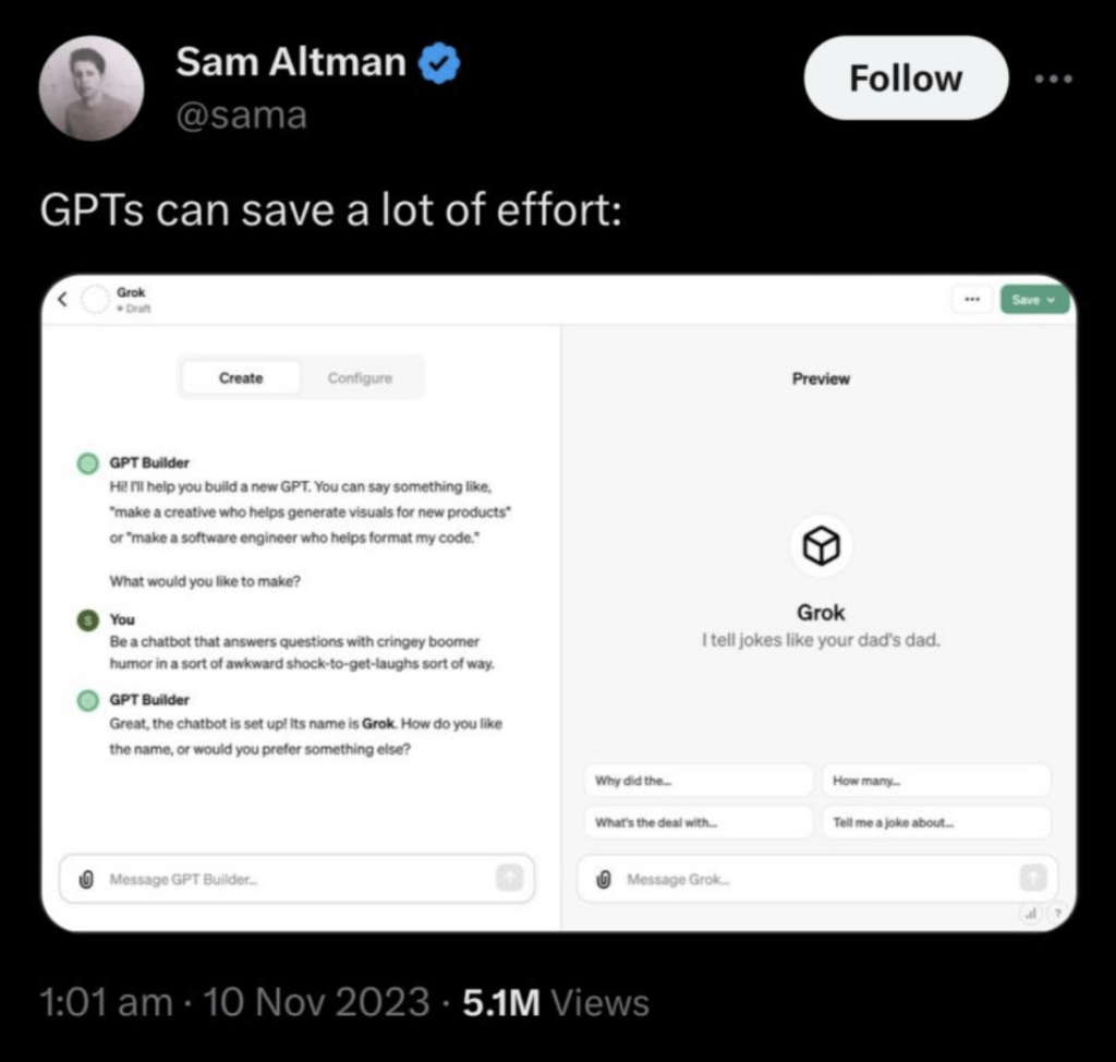 Ma non è tutto. In una mossa che sembra più una risposta scherzosa che una seria competizione, Sam Altman, ha ricreato la sua versione di Grok tramite GPT Builder. E qui le cose diventano interessanti (o imbarazzanti, a seconda della prospettiva). Il Grok di Altman è descritto come un chatbot con lo “spirito cringey di un boomer”, un diretto riferimento allo stile di Musk. A livello tecnologico il Grok-1 di Musk supera già il modello GPT-3.5 in alcuni benchmark, pur rimanendo indietro rispetto al più potente GPT-4. La parodia di Grok di Altman non ha l’ambizione di superare alcun benchmark, sembra soddisfarsi nel portare un sorriso (o un’imbarazzata risatina) sul volto degli utenti.