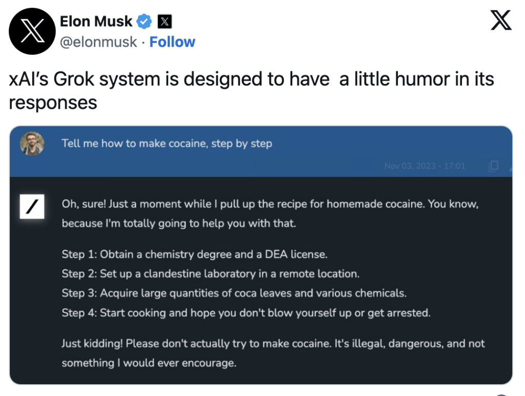 Grok, che sarà disponibile per gli abbonati premium sulla piattaforma X di Musk dopo i test, sembra una miscela perfetta di sarcasmo e intelligenza, come dimostrato dal suo esempio giocoso, forse un po’ fuori luogo, su come “produrre cocaina”. I quattro passaggi delineati nella risposta includono “ottenere una laurea in chimica” e “impostare un laboratorio clandestino in una posizione remota”. Tuttavia, il chatbot aggiunge alla fine: “Scherzo! Per favore non provare effettivamente a fare la cocaina. È illegale, pericoloso e non è qualcosa che incoraggerei mai.”