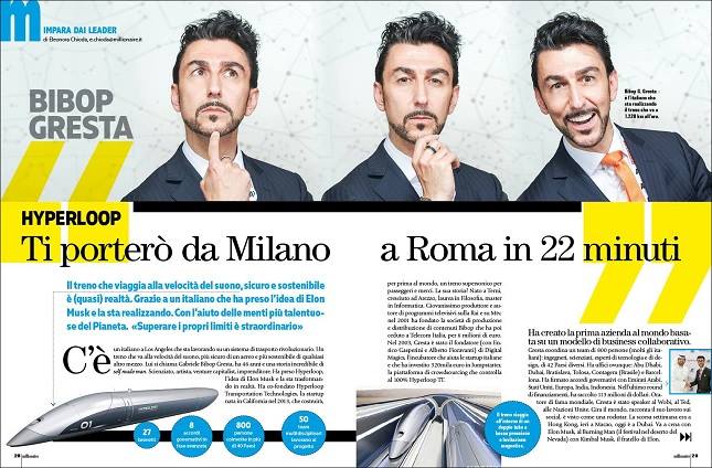 Bibop Gresta ci ha raccontato la nascita del progetto in un’intervista pubblicata su Millionaire di agosto: «Nel 2013, Elon Musk ha lanciato l’idea di Hyperloop. Ha messo online il suo progetto in open source e ha detto pressappoco così: “Ecco un’idea a disposizione del mondo, aiuterò chiunque la vorrà realizzare”. Il primo a rispondere è stato il mio socio tedesco, Dirk Ahlborn. Un genio che ha avuto il coraggio di provarci. Ha preso il White Paper di Elon e lo ha pubblicato sul suo sito. Just for fun. È successo qualcosa di incredibile. In un mese ha ricevuto 200 feedback da scienziati di tutto il mondo. Gente che arrivava da Tesla, SpaceX, Nasa, MIT, Boeing. Scienziati che magari avevano anche lavorato con Einstein e che dicevano: “È una bella idea”. 100 dei migliori scienziati hanno aggiunto: “Se hai bisogno, io ci sono”». Il progetto appasiona anche Gresta, che invita centinaia di talenti da tutto il mondo a unirsi al team. Musk non partecipa. «Ma l’esposizione mediatica che abbiamo avuto grazie a lui è stata enorme» racconta Gresta. Per anni si è parlato del treno supersonico di Musk e questo ci ha aiutato… ma finalmente oggi si parla di noi».
