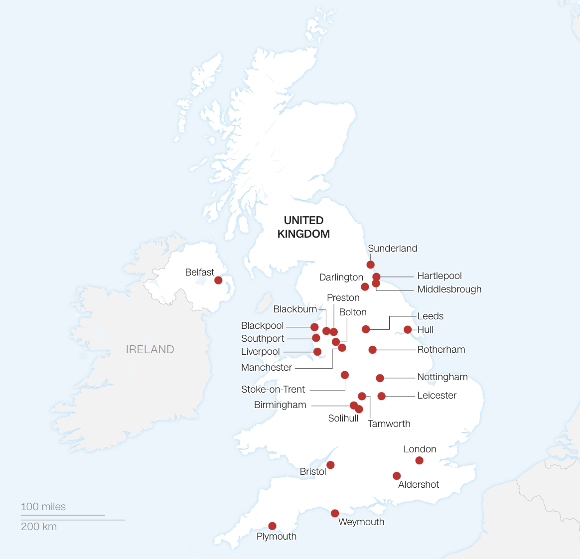 I disordini si sono allargati a macchia d’olio, segnale che aspettavano solo un’occasione propizia, e hanno coinvolto diverse città, tra cui Londra, Manchester, Belfast, Plymouth e Darlington. A Belfast, caso rarissimo, le rivolte hanno visto la partecipazione di gruppi paramilitari di fazioni storicamente opposte, ma unite dal rifiuto per gli immigrati. A Rotherham un hotel che ospitava richiedenti asilo è stato incendiato. Attacchi mirati sono stati condotti contro moschee e comunità musulmane in altre città. La polizia ha risposto con arresti e misure di sicurezza rafforzate per prevenire ulteriori episodi di violenza.