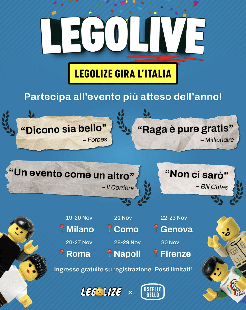 La redazione di Millionaire è andata a cercare (in un post molto criptico pubblicato su tutti i social media) più info su come accedere alle tappe del Legolive tour, e abbiamo scoperto che… “Raga, è pure gratis!”.