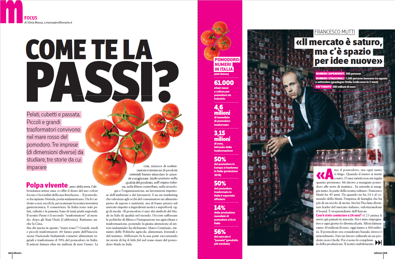Mutti, 50 anni, da quando ne ha 24 è al comando dell’impresa di famiglia che ha più di un secolo di storia. Lui l’ha fatta diventare leader del mercato italiano, valorizzandone il brand. «Il pomodoro era considerato banale, invece è straordinario» aveva raccontato in un’intervista a Millionaire. In cosa crede? «Nella bellezza che l’impresa riesce a generare. Non è solo un’entità economica, è una sfida. Poi, credo nella “distruttività”: far evolvere l’azienda in modo creativo, mantenendo le radici e certi piloni di sostegno».