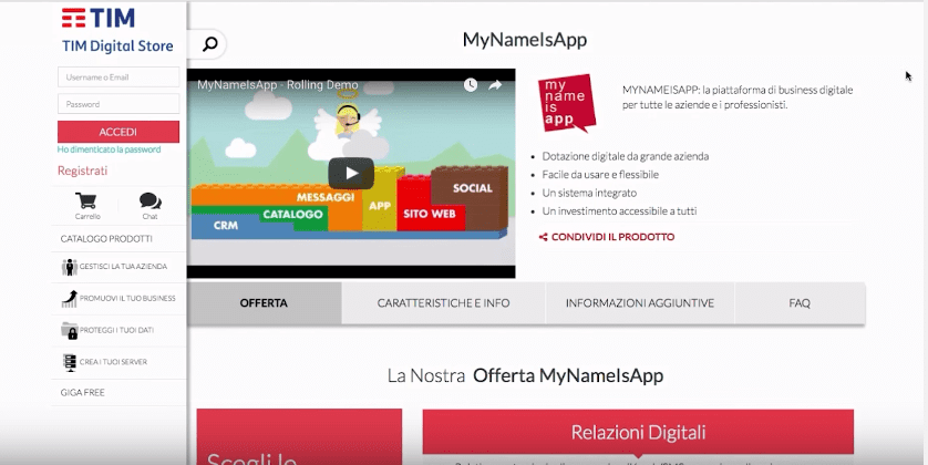 MyNameIsApp, realizzata con la piattaforma TIM Open e disponibile sul TIM Digital Store, integra in un unico ambiente digitale: centro messaggi, CRM, biglietti da visita, sistema di prenotazione, e-commerce e catalogo. Ogni elemento può essere personalizzato e gestito ovunque tramite pc e mobile.