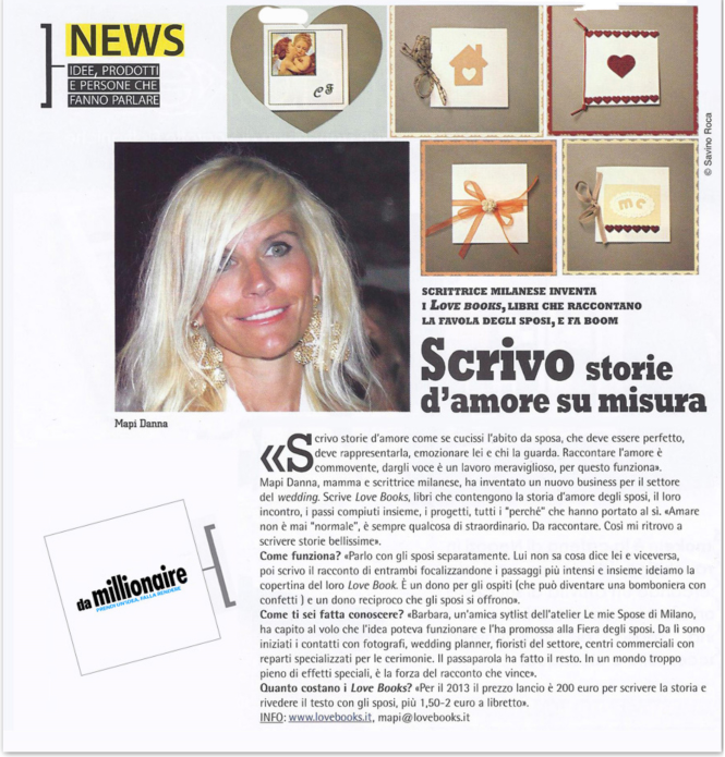 Millionaire è stato tra i primi a parlare di lei, nel 2013. E oggi Mapi Danna debutta in tv. Dal 13 febbraio, dal lunedì al venerdì, alle 13:45 su Real Time, andrà in onda Love Books, un nuovo format che racconta l’amore, attraverso la scrittura e la restituzione al destinatario e al pubblico di un piccolo libro personalizzato. «Raccontare l’amore è commovente, dargli voce è un lavoro meraviglioso. Per questo funziona», ha spiegato la scrittrice a Millionaire.