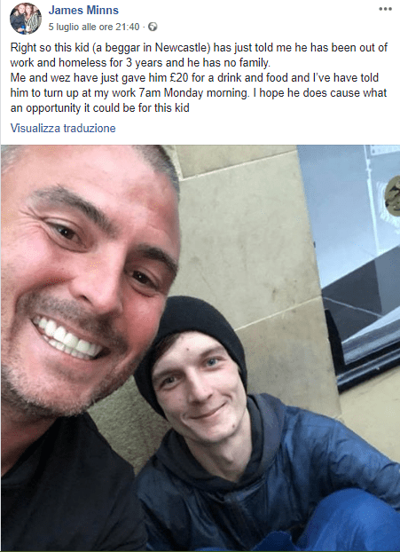 25 anni, senza casa né lavoro. Chiede l’elemosina per strada finché, tra i tanti passanti, un imprenditore si ferma a parlare con lui e gli offre un impiego. È successo a Newcastle. in Inghilterra. Protagonisti della storia Ryan Davidson, (l’ex) senzatetto, e James Minns, titolare di una società di vernici e rivestimenti. Minns ha pubblicato una foto su Facebook che ha subito conquistato il web, portando il suo racconto sulle pagine dei giornali inglesi, e non solo.