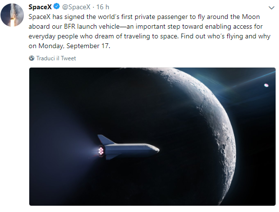Il primo turista spaziale andrà in orbita a bordo del Big Falcon Rocket (BFR), il razzo sviluppato da SpaceX. «Nella storia solo 24 uomini sono stati sulla Luna. Nessuno l’ha visitata dopo l’ultima missione Apollo nel 1972».