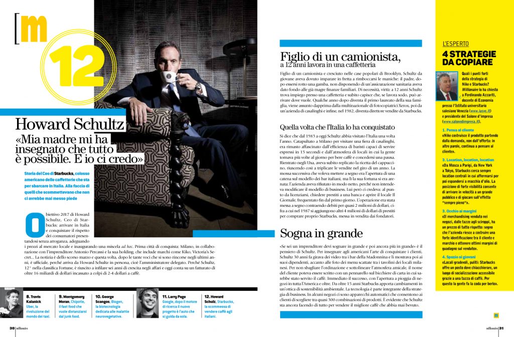 «Se sei un imprenditore devi sognare in grande e poi ancora più in grande» è il pensiero di Schultz. Per insegnare agli americani l’arte di conquistare i clienti, Schultz 30 anni fa girava dei video tra i bar della Madonnina e li mostrava poi ai suoi dipendenti, accanto alle foto dei menu scattate tra i tavolini dei locali milanesi. Per non sbagliare l’ordinazione e sottolineare l’atmosfera amicale, il nome del cliente poteva essere scritto con un pennarello sul bicchiere di carta in cui sarebbe stato servito il caffè. Immediato il successo, con l’apertura a pioggia di negozi in tutta l’America e oltre. Da oltre 15 anni Starbucks apporta cambiamenti in un’ottica di sostenibilità ambientale. La tecnologia è parte integrante della strategia di business. In alcuni negozi ci sono apparecchi automatici che consentono ai clienti di scegliere tra quasi 300 combinazioni di prodotti. È evidente che Schultz sta ancora facendo di tutto per vendere il migliore caffè che abbia mai bevuto.