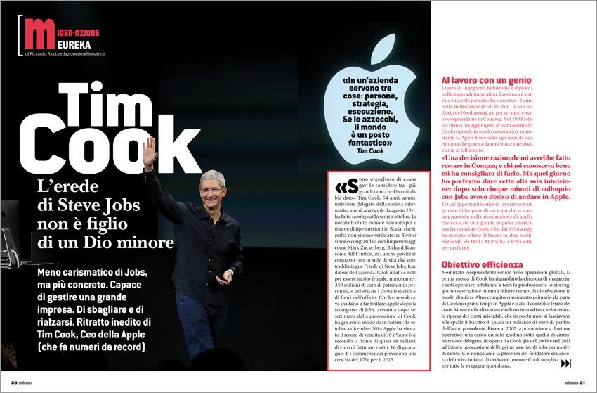 Al primo posto troviamo Tim Cook, il Ceo della Apple (parliamo della sua storia su Millionaire in edicola, l’hai letta?). Trovatosi di fronte a un’eredità immensa, quella di Steve Jobs «Cook ha saputo guidare l’azienda con forza e numeri: guadagni record per i negozi Apple. Con Apple Pay e Apple Watch, l’azienda ha saputo mostrare ancora una volta il suo appetito per l’innovazione. Inoltre, dichiarando la sua omosessualità, è diventato un esempio di come gestire vita privata e affari» sottolinea Fortune.