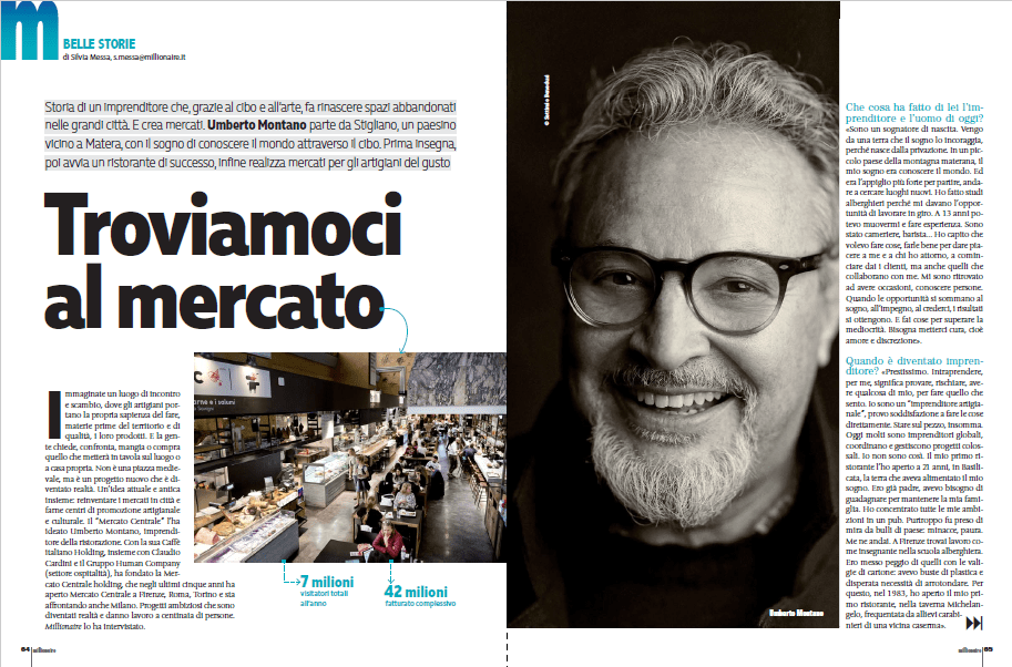 Immaginate un luogo di incontro e scambio, dove gli artigiani portano la propria sapienza del fare, materie prime del territorio e di qualità, i loro prodotti. E la gente chiede, confronta, mangia o compra quello che metterà in tavola sul luogo o a casa propria. Non è una piazza medievale, ma è un progetto nuovo che è diventato realtà. Un’idea attuale e antica insieme: reinventare i mercati in città e farne centri di promozione artigianale e culturale. Il “Mercato Centrale” l’ha ideato Umberto Montano, imprenditore della ristorazione. Con la sua Caffè italiano Holding, insieme con Claudio Cardini e il Gruppo Human Company (settore ospitalità), ha fondato la Mercato Centrale holding, che negli ultimi cinque anni ha aperto Mercato Centrale a Firenze, Roma, Torino e in primavera aprirà a Milano, negli spazi della Stazione centrale. Progetti ambiziosi che sono diventati realtà e danno lavoro a centinaia di persone. Millionaire lo ha intervistato.