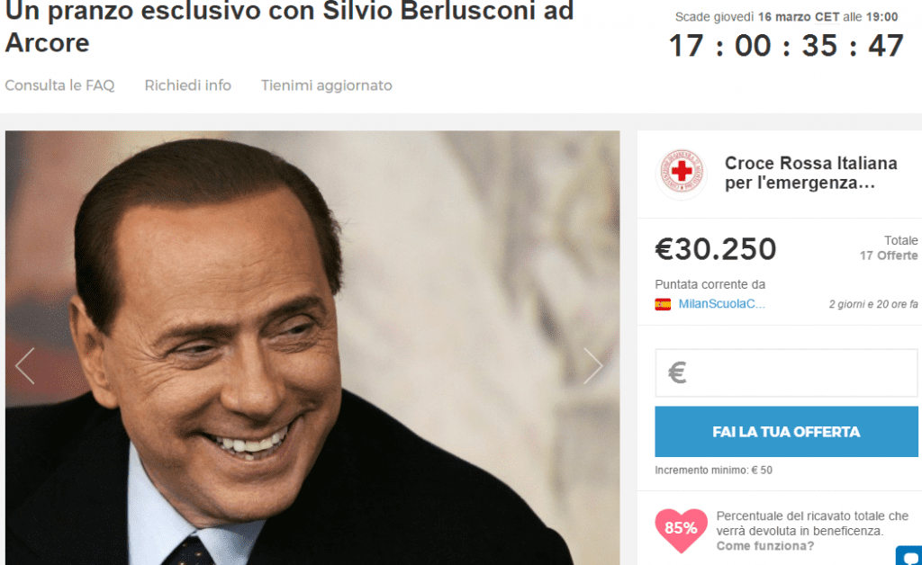 Info: https://www.charitystars.com/product/pranza-con-silvio-berlusconi