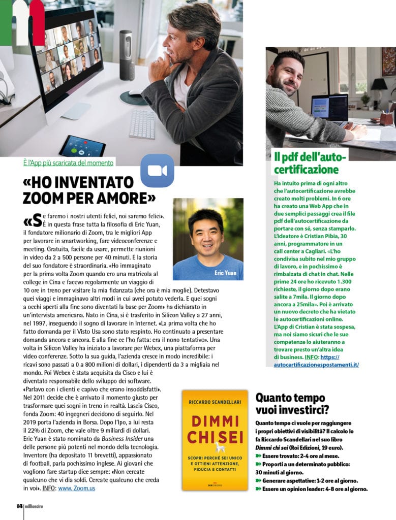 Zoom: è l’app per videoconferenze più scaricata durante la pandemia. È passata da 20 a 300 milioni di utenti attivi al giorno. Permette di fare riunioni da 2 a 500 persone. Facile da usare, ha avuto però diversi problemi di sicurezza e privacy. Le sue azioni sono cresciute del 300%. La storia del suo fondatore è straordinaria.